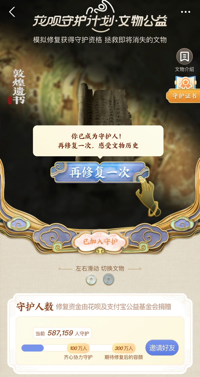 相關頁面顯示,敦煌遺書、龍門風雨琴、三星堆青銅人像等文物已被確立為首批計劃支持修復文物。此外,通過支付寶搜“守護文物”,網友能夠直接進入“花唄文物守護計劃”的互動界面,并用數字化的方式體驗文物修復過程,上線至今,已有超50萬網友借此云上修文物。
