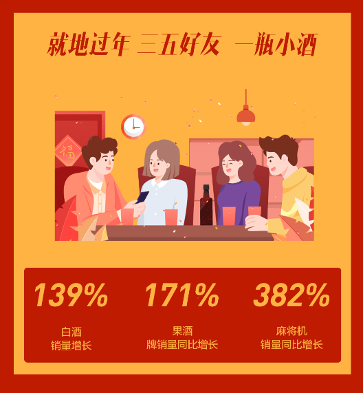 呼朋喚友的春節(jié),酒水必不可少,年貨節(jié)期間,蘇寧易購酒類銷量同比增長123%,其中白酒銷量增長139%,果酒銷量同比增長171%。