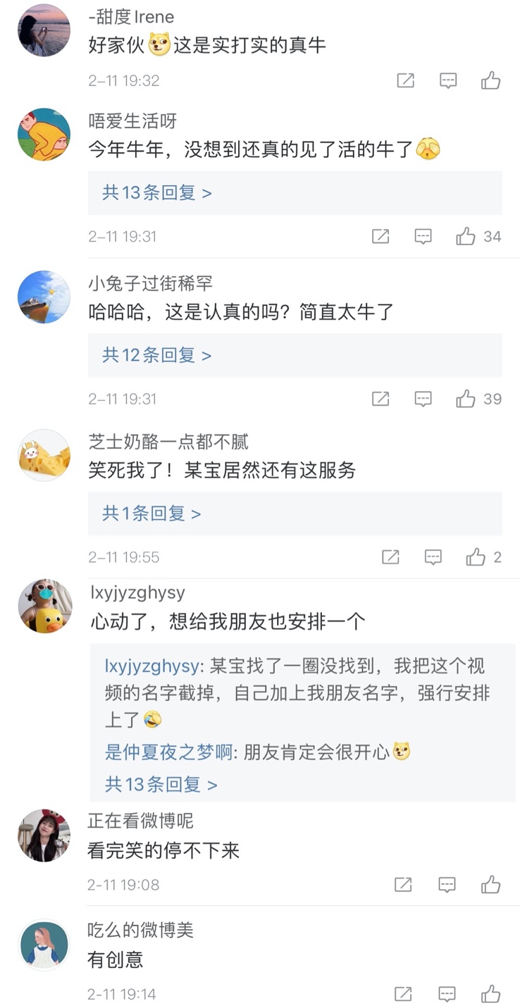 尤其是今年牛年,年輕人拜年甚至連“真牛”都用上了。年三十就有網(wǎng)友在社交平臺分享收到的“奇葩”定制拜年視頻,視頻中的主角是一群牛,牛的主人則在一旁配音:“Wi-Fi放在牛身上,是新年‘無限牛’的祝福;把牛點回家,寓意你‘牛到家了’;小黃鴨騎在牛背上,即,你真‘牛鴨’……”