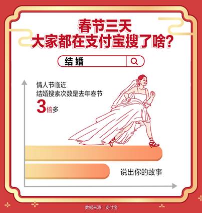 支付寶搜索數(shù)據(jù)顯示,春節(jié)假期前三天,網(wǎng)友搜索“結(jié)婚”的次數(shù)是去年春節(jié)前三天的3倍多。搜索“結(jié)婚”可直達支付寶“結(jié)婚一條街”,直接呈現(xiàn)相關(guān)服務(wù),訪問量靠前的是“婚姻登記預(yù)約”、“結(jié)婚攝影”,其中結(jié)婚攝影小程序訪問量翻倍。此外,這三天“鮮花”的搜索量也較1月同期增長了129%。