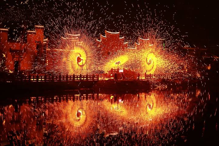 坐擁面積42萬(wàn)平方米,集度假休閑、非遺體驗(yàn)、故居游覽、徽派藝術(shù)、星級(jí)酒店于一體的中國(guó)徽文化沉浸式體驗(yàn)度假小鎮(zhèn)——安徽蕪湖鳩茲古鎮(zhèn),元宵佳節(jié)在夜間推出了國(guó)家級(jí)非遺質(zhì)文化遺產(chǎn)打鐵花、賞燈會(huì)、徽商演藝情景劇、篝火晚會(huì)、煙花盛宴等項(xiàng)目。