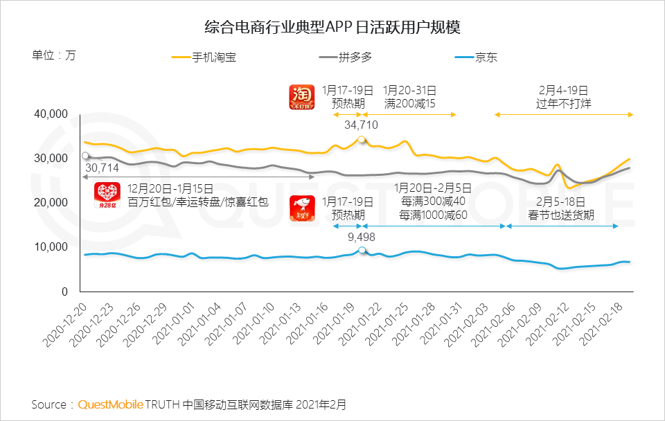 ▲QuestMobile數(shù)據(jù)顯示,大年初一和初二(2月12日和2月13日)兩天,拼多多APP的日活躍用戶數(shù)(DAU)登頂行業(yè)第一。