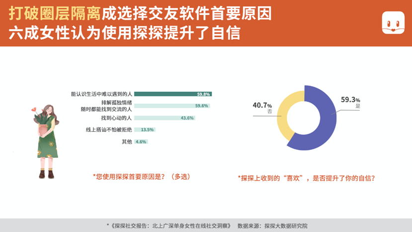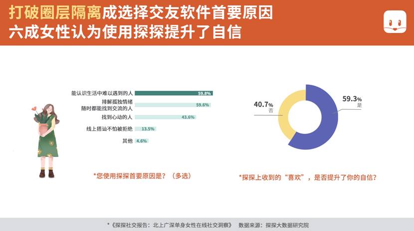 跟傳統相親市場中備受挫折、挑揀的體驗相比,使用交友軟件無需親屬介入私人事務,無需用刻板的婚戀標準評價自己,這讓崇尚獨立的單身女性感覺更加自由和自主。本次調研還顯示,交友軟件有效提升了單身女性的自信,59.3%的受訪者贊同,使用探探讓自己與異性交往時更加自信。
