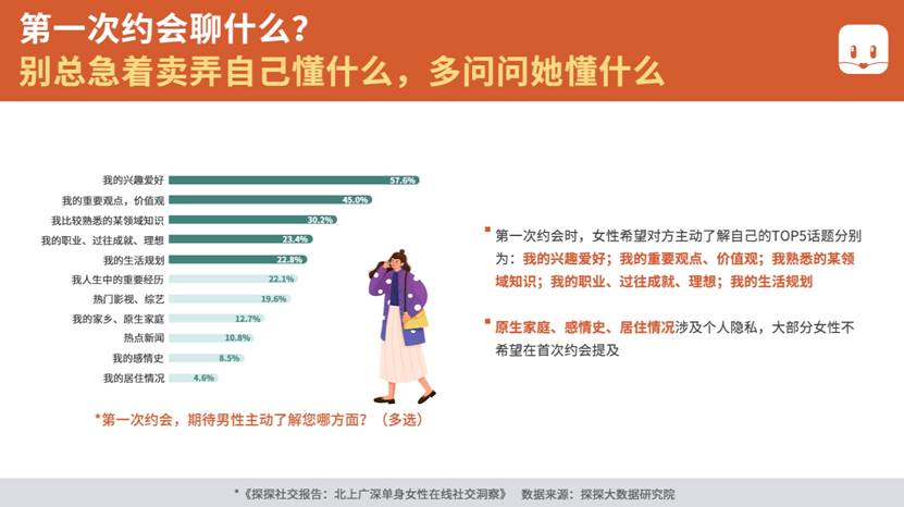 此外,原生家庭、感情史、居住情況涉及個人隱私,大部分女性不希望在首次約會中被問及。