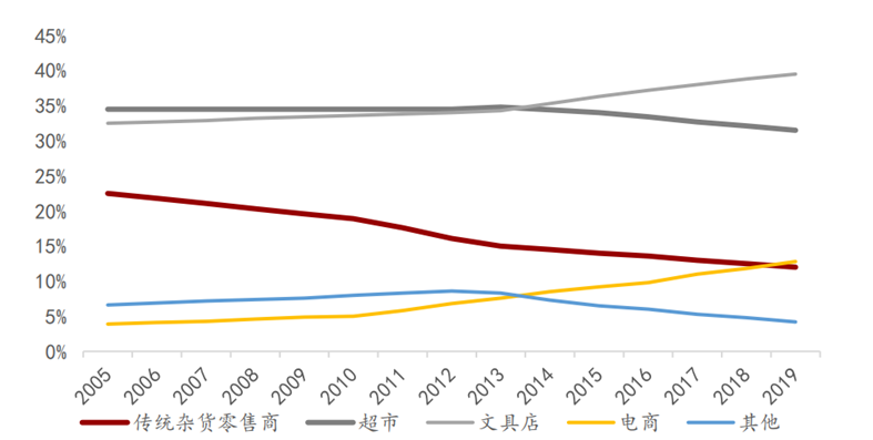 ▲中國近年來書寫工具銷售渠道占比變化情況。(來源:Euromonitor、萬聯證券研究所)