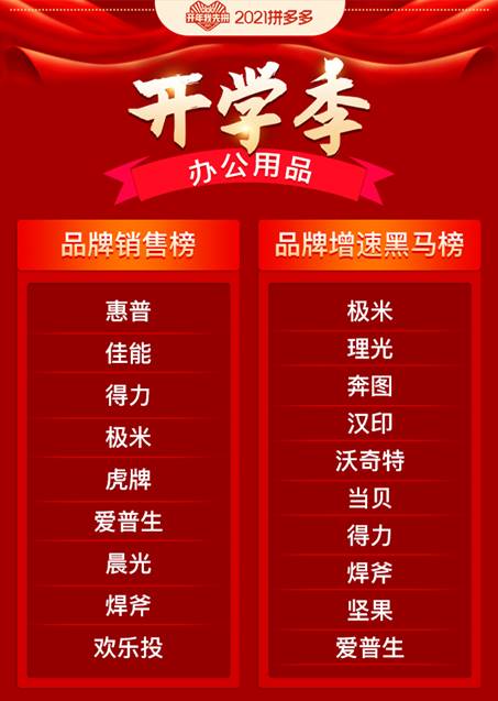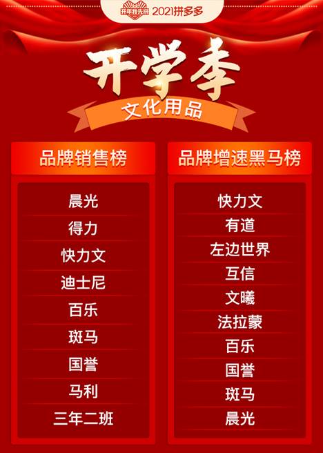 眾多文具品牌從去年下半年紛紛入駐拼多多,在今年的“小學訊”期間,平臺相關訂單量同比增長了近300%,部分時間段銷售額甚至超過了去年雙十一。目前已入駐的既有得力、有道、三年二班、佳能、堅果、優學派、奔圖等大品牌,也有左邊世界這樣贏得紙張本冊類目“開學季”銷量第一的黑馬。