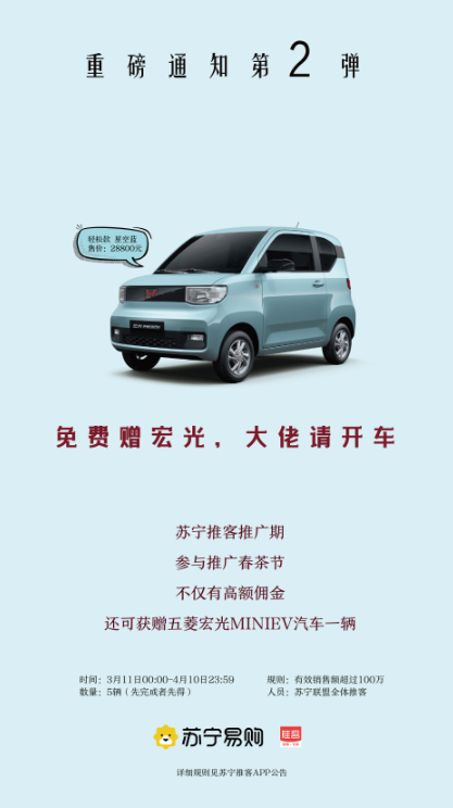 速途網3月10日消息(報道:李楠)今日,蘇寧社交電商再發重磅通知:3月11日-4月10日,前五名推廣春茶節專場商品銷售額超過100萬的推客,將獲得五菱宏光MINIEV一輛。只要是蘇寧聯盟注冊的推客均可參加活動。