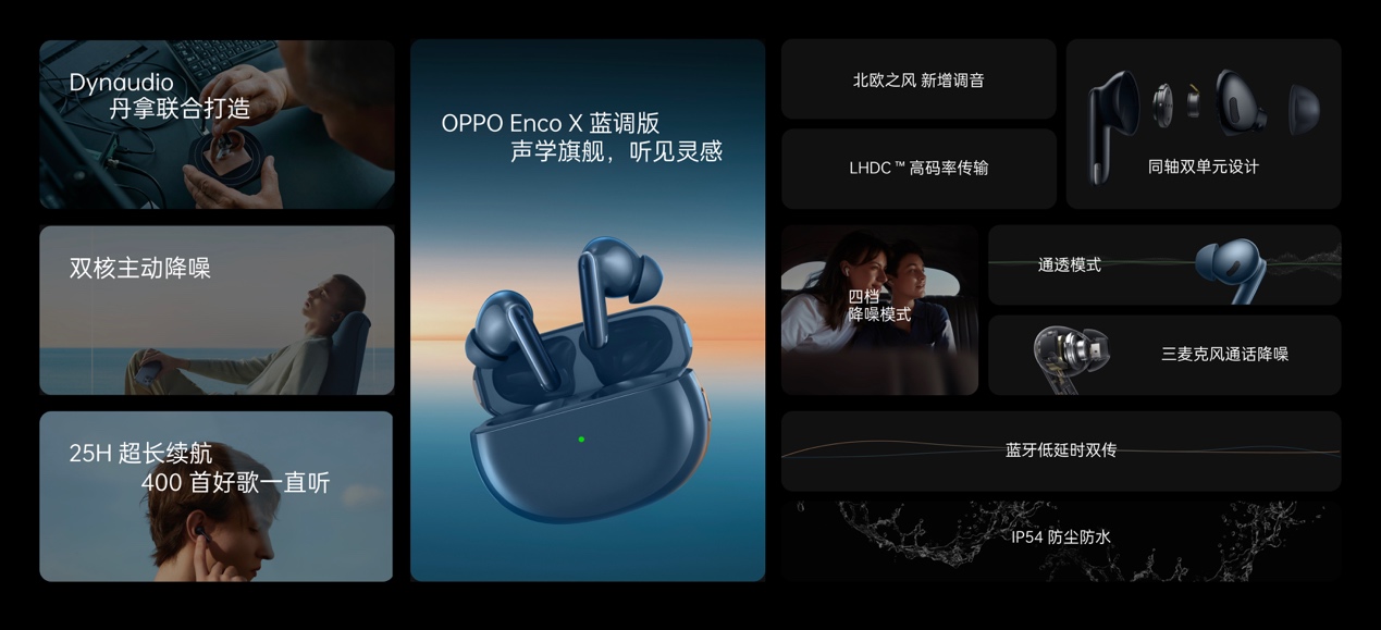去年亮相的OPPO Enco X白歌、夜曲、竹韻配色,以及此次新增的藍調版,命名靈感均來源于歌曲與韻律。藍調象征著自由、無約束的精神,這一新配色也為更多熱愛音樂、熱衷于探索自由之聲的用戶提供了更具個性化的外觀選擇。