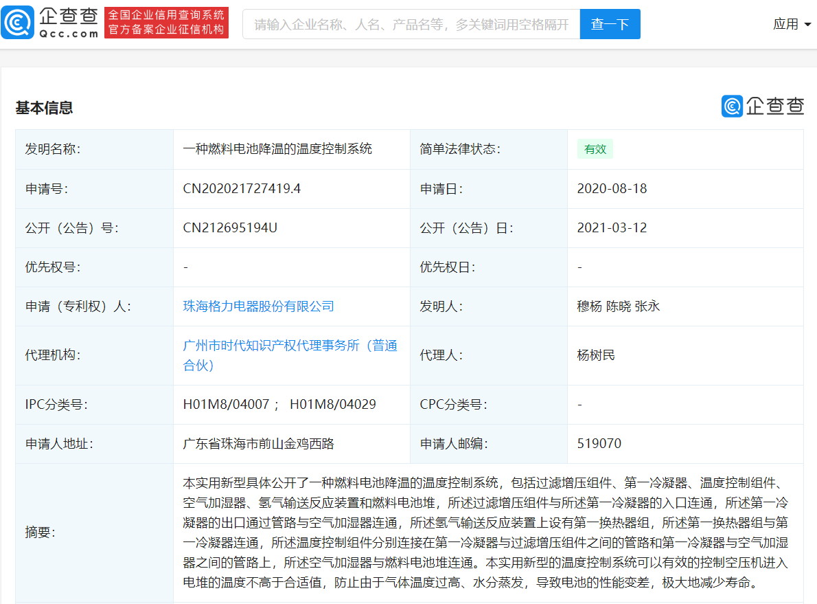 速途網(wǎng)3月15日訊(報(bào)道:喬志斌)根據(jù)企查查APP顯示,近日,格力電器公開專利“一種燃料電池降溫的溫度控制系統(tǒng)”,專利公開日期為3月12日,專利公開號為CN212695194U,專利摘要顯示:本實(shí)用新型具體公開了一種燃料電池降溫的溫度控制系統(tǒng)。本實(shí)用新型的溫度控制系統(tǒng)可以有效的控制空壓機(jī)進(jìn)入電堆的溫度不高于合適值,防止由于氣體溫度過高、水分蒸發(fā),導(dǎo)致電池的性能變差,極大地減少壽命。