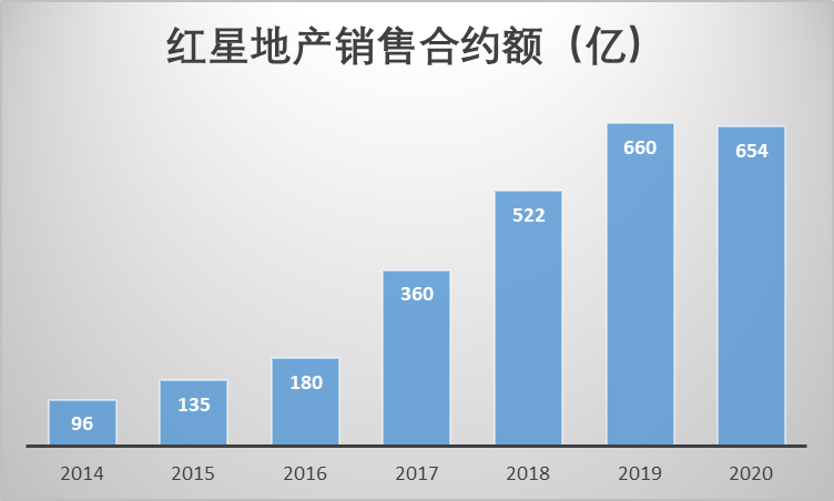 排名高當(dāng)然是因?yàn)橛袌?jiān)實(shí)的業(yè)績做支撐。紅星地產(chǎn)的銷售合約額從2014年的96億元增長至去年的654億元,6年漲了近7倍!即便遭遇疫情沖擊,依然實(shí)現(xiàn)了37.7%的年復(fù)合增速。