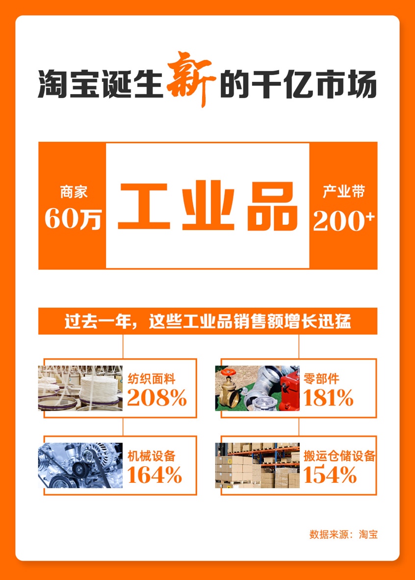 數(shù)據(jù)顯示,過去一年,淘寶上有多類工業(yè)品銷售額增長(zhǎng)迅猛。其中,紡織面料同比增長(zhǎng)208%,零部件同比增長(zhǎng)181%,機(jī)械設(shè)備同比增長(zhǎng)164%,搬運(yùn)倉儲(chǔ)設(shè)備同比增長(zhǎng) 154%,橡塑材料及制品同比增長(zhǎng)112%。