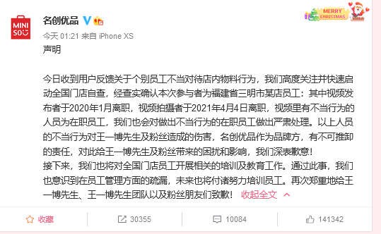 4月9日凌晨,名創(chuàng)優(yōu)品在其官方微博就此事發(fā)布了道歉聲明,表示這是“個別員工不當對待店內(nèi)物料行為”,官方對此“鄭重給王一博先生、王一博先生團隊以及粉絲朋友們道歉!”。另外,名創(chuàng)優(yōu)品還解釋稱:會對惡意銷毀王一博物料的員工作出處罰,視頻發(fā)布者及拍攝者分別于2020年1月與4月4日離職。