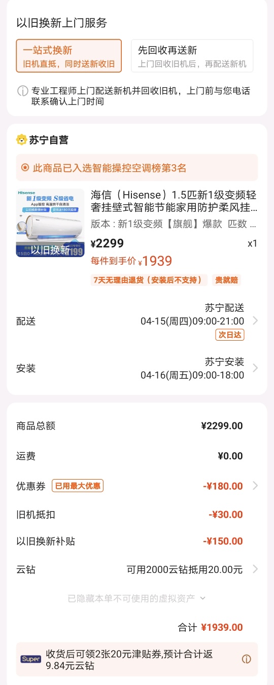 4月14日,蘇寧易購最新版以舊換新正式上線。據頁面顯示,一鍵“立即換新”,即可進行差價付款和一站式補貼直換。在新品訂單頁面,用戶也可以選擇一站式“同時拖舊送新”或先回收再送新。新機最快1小時即可到手。