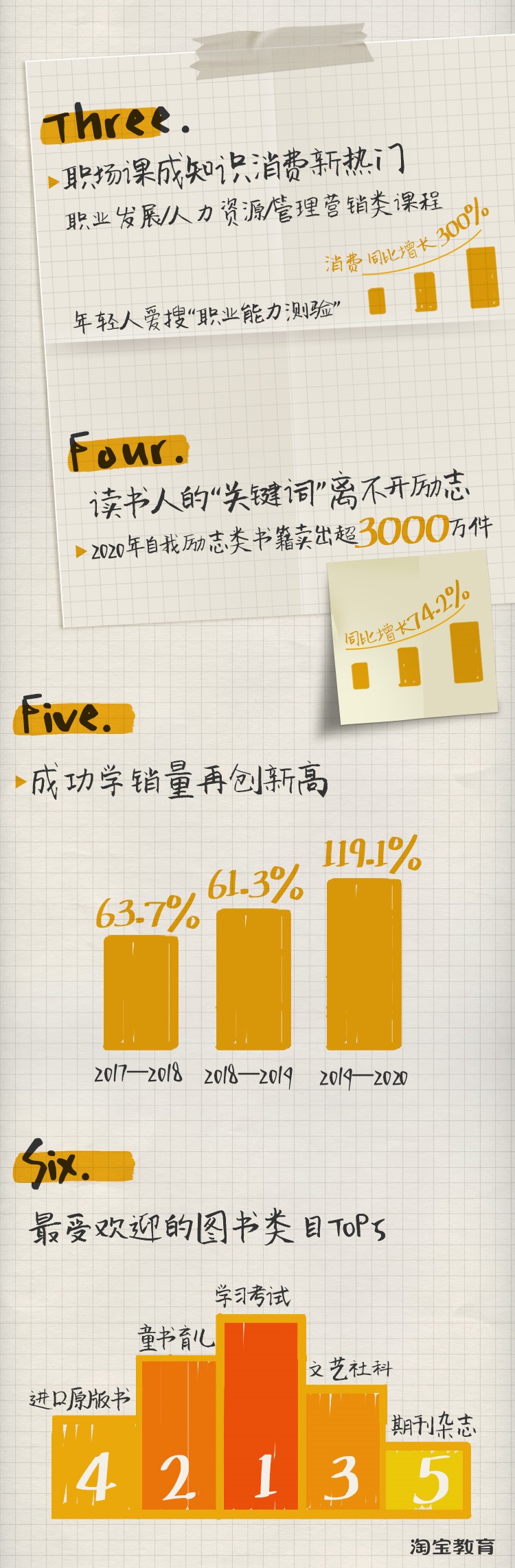 當然,學習并不只適用于校園。職業規劃類圖書和課程已然成為95后、00后的職場助手。“職業能力測驗”占據天貓教材熱銷榜,職業發展、人力資源、管理營銷類課程的消費也同比增長超300%,實用主義成為年輕人的職場選擇。
