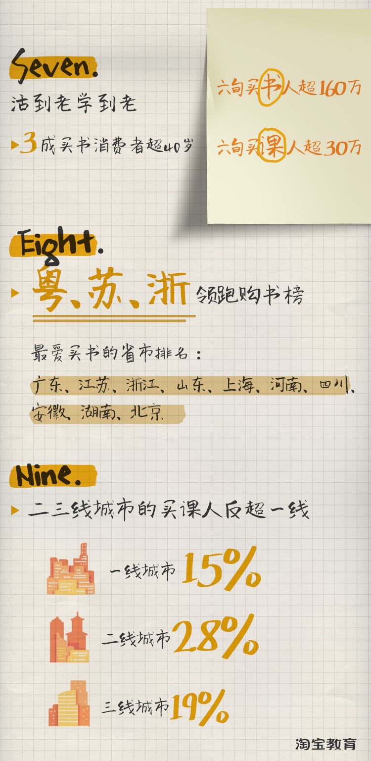 一個有趣的現象是,在買課人群中,一線城市的消費者占比僅為15%,來自二線、三線城市的用戶均超過了一線。網上學習正讓身處異地的消費者成為“同學”。淘寶教育運營總監葉挺表示,左手買書右手買課,正成為消費者“淘知識”的組合套餐。這背后正是淘寶天貓多樣的商品供給,在滿足人們從生活消費到自我投資的進階需求。
