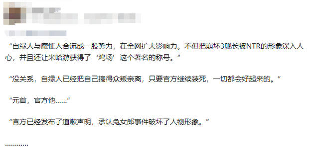 為米哈游說話的玩家也很憤怒:邊兩方混戰了半天,你官方自己出來掀臺,對沖這么久你不吱聲,一開腔就是插刀打臉一條龍?