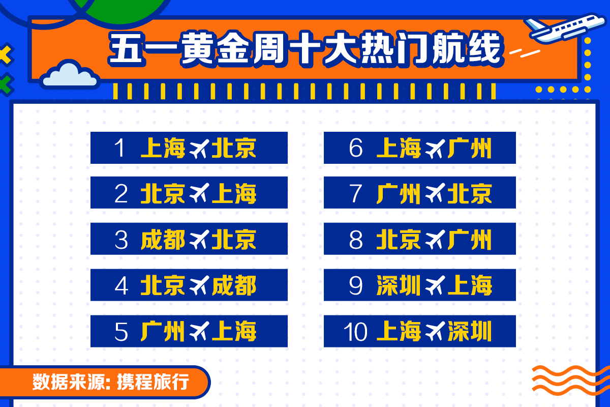 消費者跨省出游意愿強烈,攜程機票單日訂單量對比2019年同期最高增幅約28%。上海-北京、北京-上海、成都-北京、北京-成都、廣州-上海、上海-廣州、廣州-北京、北京-廣州、深圳-上海、上海-深圳為“五一”黃金周十大熱門航線。