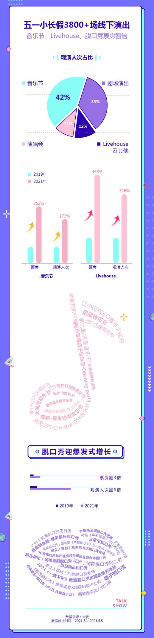 速途網5月6日消息(報道:李楠)今日,大麥發布《2021五一檔演出觀察》,對五一小長假期間的演出市場進行了總結。報告顯示,五天小長假線下專業演出超3800場,各類演出供給穩步提升,其中Livehouse、脫口秀、音樂節票房表現亮眼,與2019年同期相比,增幅較均超250%。
