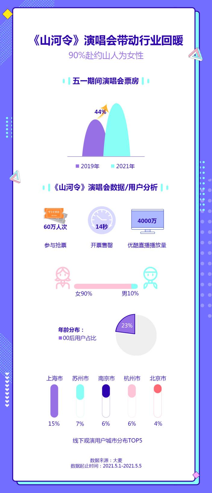 值得一提的是,頭部項目帶動了演唱會市場的回暖。大麥數據顯示,五一小長假期間,演唱會票房較2019年同期增長44%。其中,生來知己《山河令》主題演唱會和R1SE告別限定演唱會四場萬人以上的演唱會分別吸引了數萬粉絲前去觀演。
