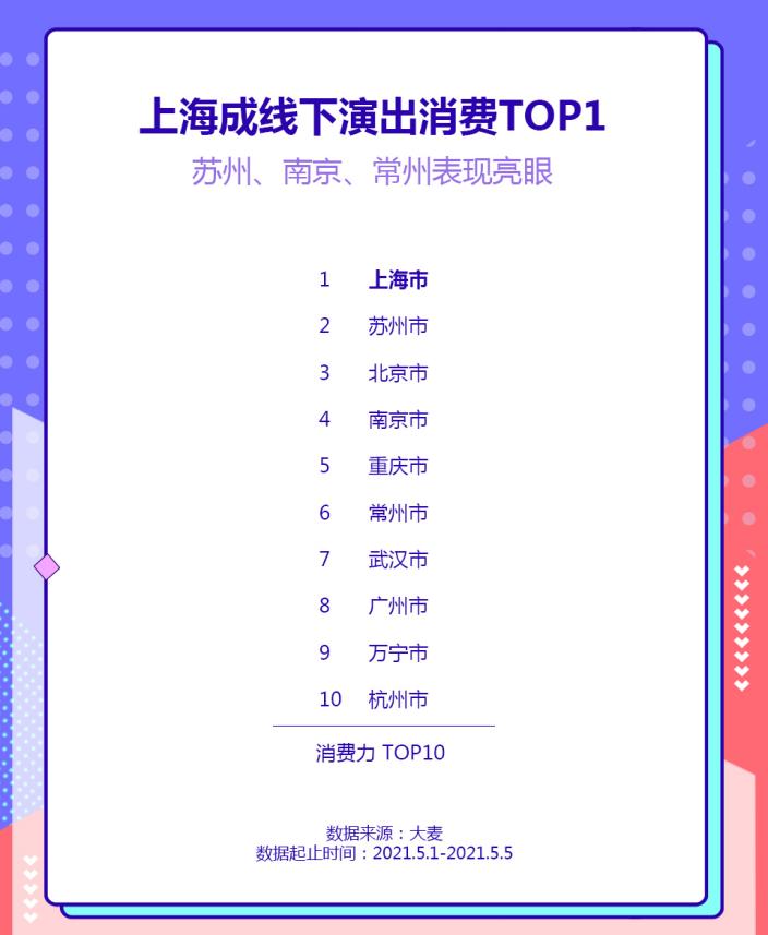 從消費力來看,今年五一小長假期間,二線城市現場演出消費力表現亮眼。蘇州依靠生來知己《山河令》主題演唱會,消費力趕超北京、廣州、重慶等一線城市位列第二,而海南·萬寧日月灣M_DSK音樂節也讓縣級市萬寧躋身全國前十。