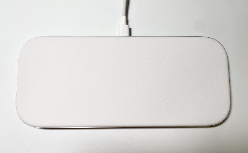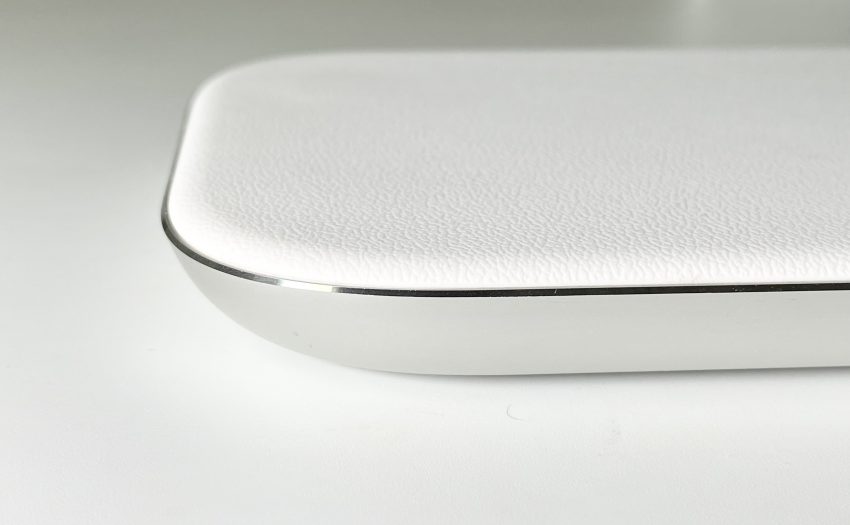 小米多線圈無線快充板的表面采用了親膚的硅膠材質,觸感十分柔和,上方的仿皮質紋理,在提升質感的同時,也提升了手機放置于其上時的摩擦力。而承載整個充電板的是材質為CNC一體成型的鋁合金邊框,與面板的銜接處還切割出了一條亮線,進一步提升了充電板的精致感。