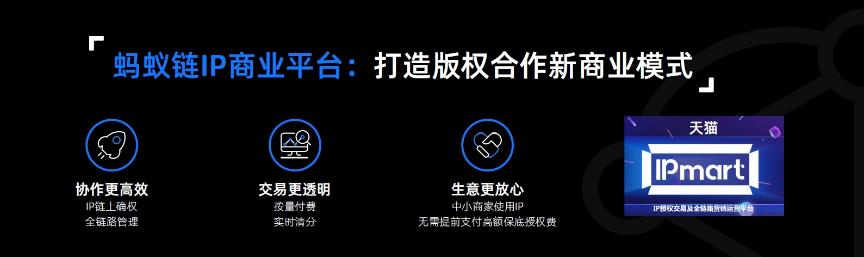“支付寶當初就是給買賣雙方提供了一個第三方擔保,陌生人才敢于交易,而在螞蟻鏈的IP商業平臺中,區塊鏈技術成為了這個第三方,中小商家使用IP不必再提前支付高額的保底授權費,減少了交易中的不確定性和博弈,我們認為這是最具創新價值的地方?!蔽浵伡瘓F副總裁、智能科技事業群總裁蔣國飛表示。
