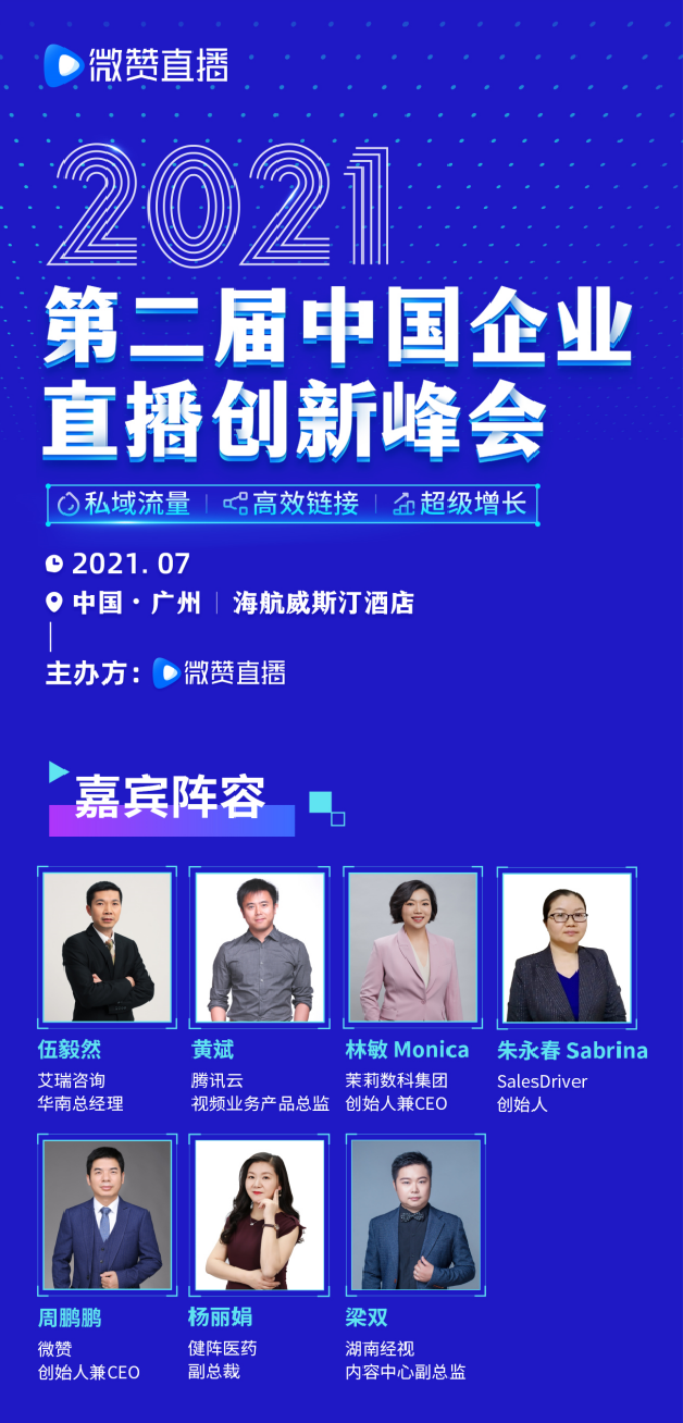 私域流量·高效鏈接·超級增長的2021中國企業直播創新峰會正式啟動。時下,既是企業直播的高速增長期,也是整個中國企業直播營銷的戰略機遇期。風口已至,7月9日,由中國企業直播行業頭部服務商微贊直播主辦的企業直播第二屆2021中國企業直播創新峰會如約而來。
