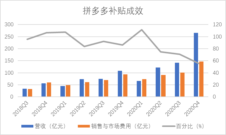 “下一季度會繼續‘百億補貼’戰略”,拼多多創始人黃崢在2019年第三季度財報電話會議的表態打消了投資者以及消費者的顧慮。而后我們看到了,百億補貼開始為拼多多帶來越來越多的營收,其在2020年Q3才首次單季超過100億元,并在2020年第四季度將其在營收的占比降至55.4%。這說明,“百億補貼”戰略確實為拼多多的增長注入了強勁動力,在講究ROI的時代,百億補貼詮釋了投入的高效。