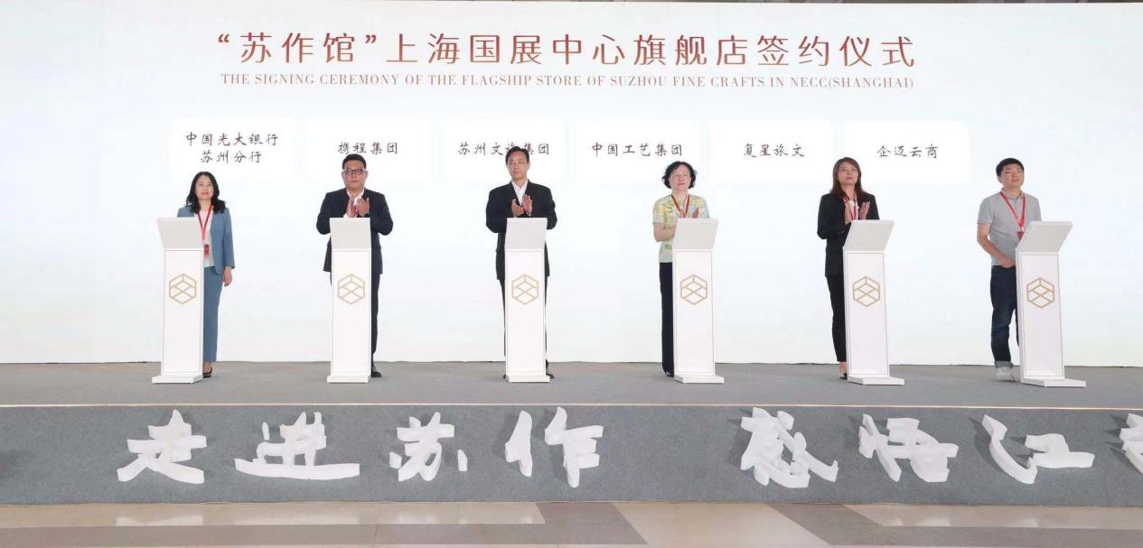 速途網5月27日消息(報道:李楠)日前,“蘇作館”上海國展中心旗艦店在上海國際會展中心舉行隆重開館儀式。江蘇省委常委、蘇州市委書記許昆林,上海市人民政府副市長陳通,蘇州市人大常委會主任陳振一,市政協主席周偉強,中國工藝美術協會常務副會長、中國工藝(集團)副董事長張紅出席活動。攜程集團CEO孫潔,攜程集團副總裁、商業拓展和政府合作部CEO王韋受邀出席開館儀式現場。