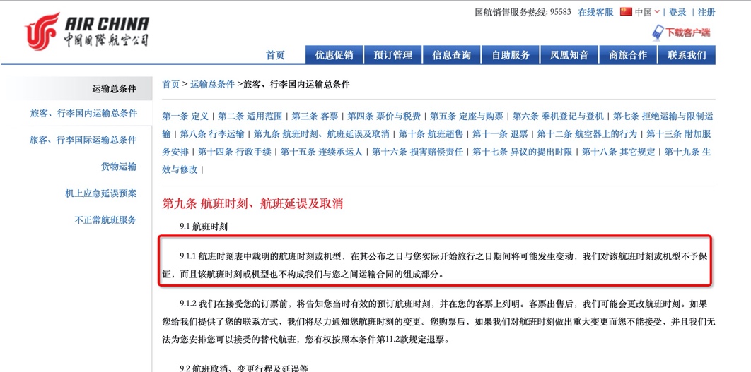 《民法典》第四百九十六條規定,“采用格式條款訂立合同的,提供格式條款的一方應當遵循公平原則確定當事人之間的權利和義務,并采取合理的方式提示對方注意免除或者減輕其責任等與對方有重大利害關系的條款,按照對方的要求,對該條款予以說明”。從實際操作來看,國航官網在實際預訂機票的全過程中僅在航班信息下方提示客戶注意退票費用和運輸條件,但并未以顯著且合理的方式將其標出,運輸總條件的鏈接更是以常規字體隱藏在下方的灰色區域中,很難達到提示客戶注意這一格式條款的目的。因此,國航《運輸總條件》中關于機型可能發生變動,且不構成運輸合同的說法,很難說能夠真正構成對旅客和航司均具有約束力的合同條款。