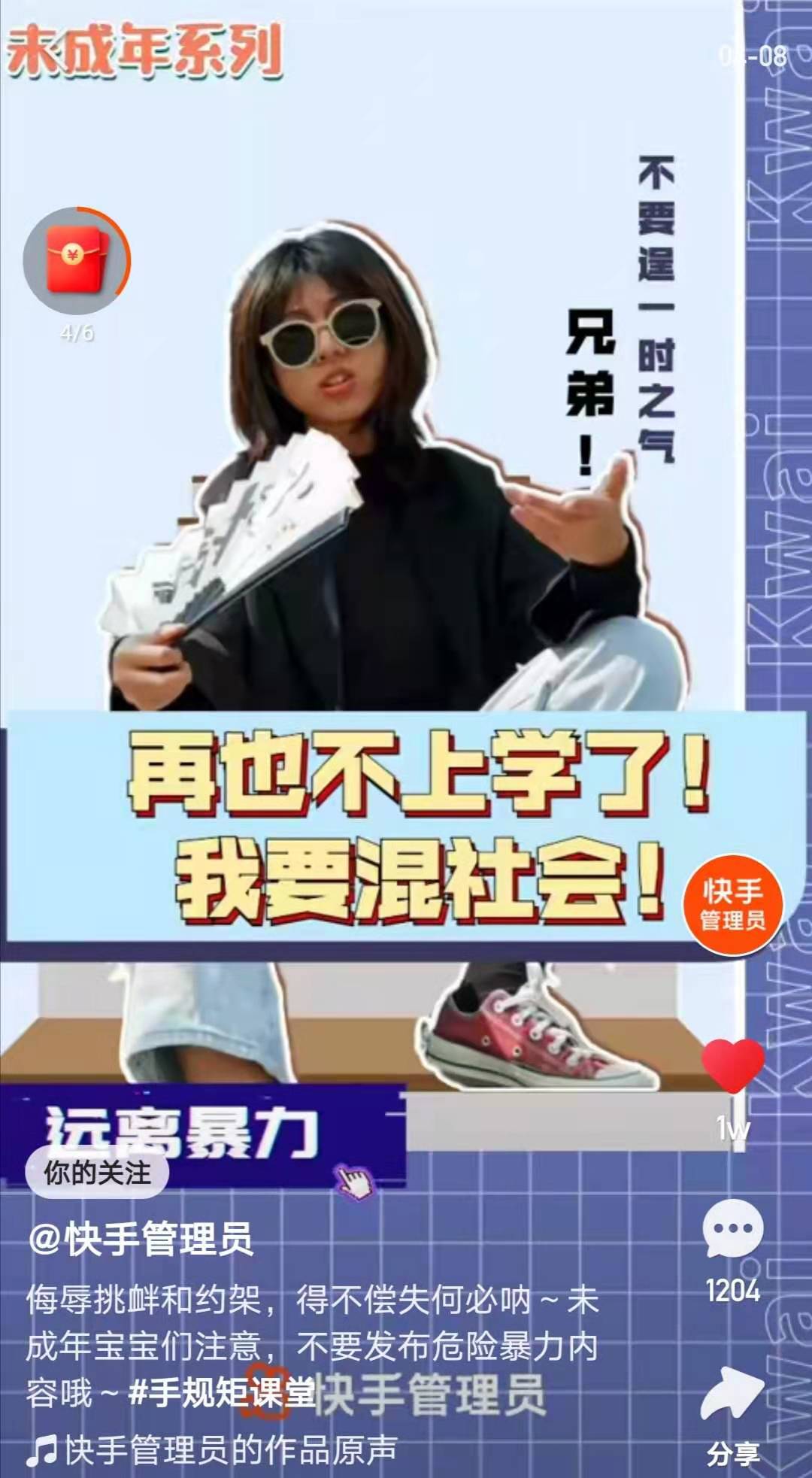 管理員們要了解鐵子們的所思所想,要讓鐵子們尤其是未成年人接受自己視頻或直播中的內(nèi)容,前期都要做大量的準(zhǔn)備工作。可能最后表現(xiàn)出的是輕松加愉快的視頻或直播,其實(shí)從前期的調(diào)研到違規(guī)內(nèi)容的查看、分析,以及腳本的創(chuàng)意、撰寫、剪輯等,管理員們也是絞盡腦汁呢。對(duì)了,快手管理員把這個(gè)拍成了一期視頻《管理員的一天》,這是為了滿足鐵子們的好奇心,看來官方還是很寵粉的嘛!