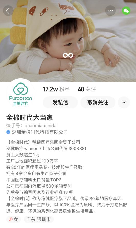 作為穩健醫療的全資子公司,全棉時代成立于2009年,主營個護家居、嬰童用品、孕產護理、貼身衣物、服裝服飾等全品類棉產品。今年3月22日,全棉時代加入快手品牌自播團隊,以“全棉時代大當家”的賬號名稱0粉開播。