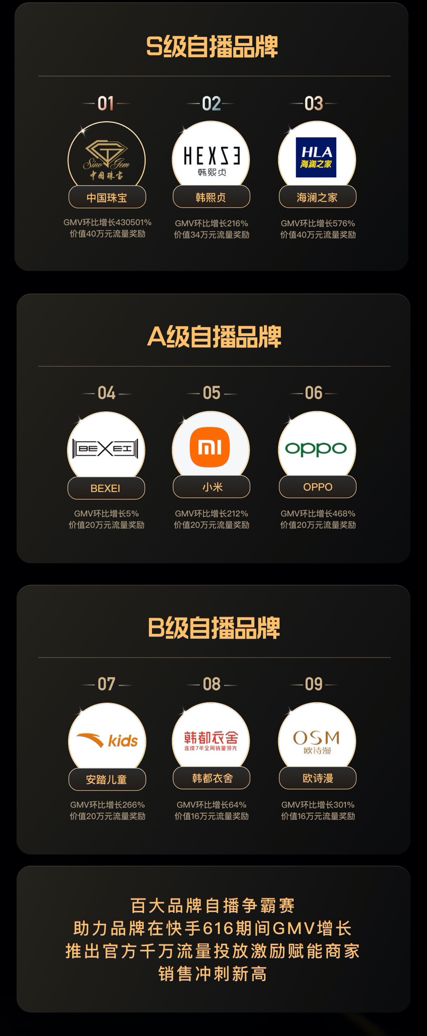 在6月1日-14日活動期內,中國珠寶、韓熙貞、海瀾之家、小米、OPPO、安踏兒童等知名品牌成為快手616品牌自播爭霸賽第二階段自播GMV增長TOP10商家。整體品牌自播GMV環比活動前增長148%。
