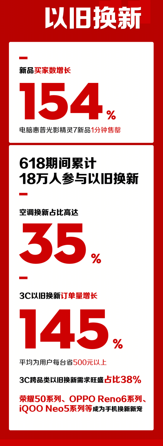 其中,空調換新占比高達35%。3C以舊換新訂單量同比增長145%,占換跨品類換新訂單總量的38%,平均每單為用戶省500元。榮耀50系列、OPPOReno6系列、iQOO Neo5系列等成為手機換新新寵。