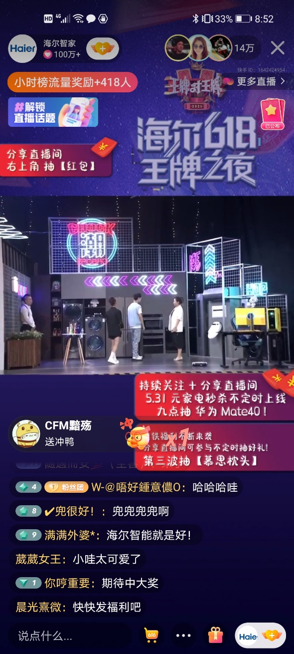 在3小時的直播中,兩隊圍繞“智”“趣”“新”“潮”四個盲盒空間展開PK,通過趣味講解和趣味挑戰(zhàn)對海爾產(chǎn)品進行推介,并以王牌游戲環(huán)節(jié)角逐盲盒福利發(fā)放權(quán),為廣大快手網(wǎng)友們帶來超低價家電秒殺、現(xiàn)金寵粉紅包等多重驚喜,更有神秘嘉賓喬杉現(xiàn)場連線,引得直播現(xiàn)場歡呼不斷。