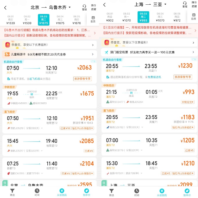 為方便旅客出游,去哪兒攜手海南航空推出“自由飛”,購買自由飛的旅客將以更優惠的價格鎖定飛行權益,在合適的時間兌換即可出行。以北京-烏魯木齊為例,8月3日出發的直飛航班最低票價為1951元(不含機建燃油費),而通過“自由飛”購買的北京-烏魯木齊的機票價格僅為1240元(不含機建燃油費),便宜近一半。