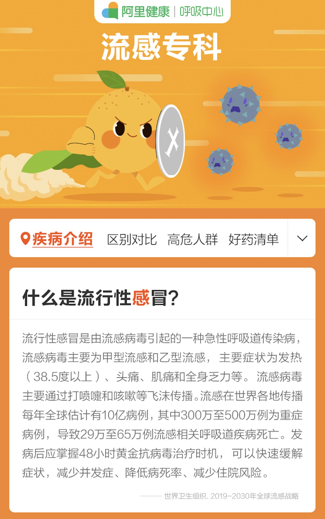 7月17日,羅氏選擇在阿里健康大藥房線上首發該款重磅創新藥。同時期,由羅氏和阿里健康共建的呼吸中心流感專科也正式上線,用戶打開淘寶 APP 搜索 “阿里健康大藥房 ”, 進入頁面后,可在“疾病中心”板塊找到“流感專科”入口,了解流感疾病防護與治療知識,在線咨詢專家、藥師,選購藥品等。