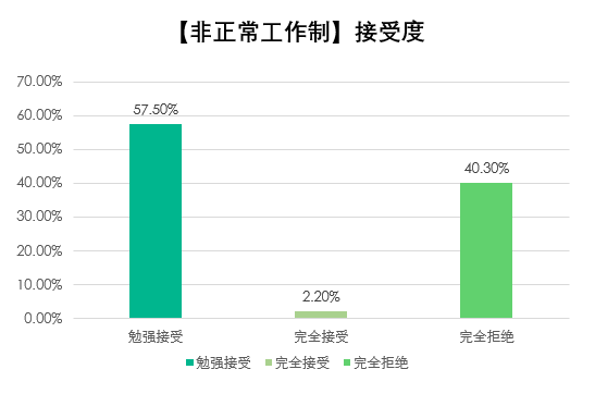 速途網7月26日消息(報道:李楠)今日,拉勾招聘發布《互聯網行業非正常工作制民意調查報告》,對上千位互聯網從業人員進行了問卷調查。報告顯示,互聯網人中78.4%曾有過非正常工作制的經歷,57.5%出于對薪資、職業發展等因素的考慮勉強接受,40.3%完全拒絕,僅有2.2%的從業者認為非正常工作制度合理,可以完全接受。