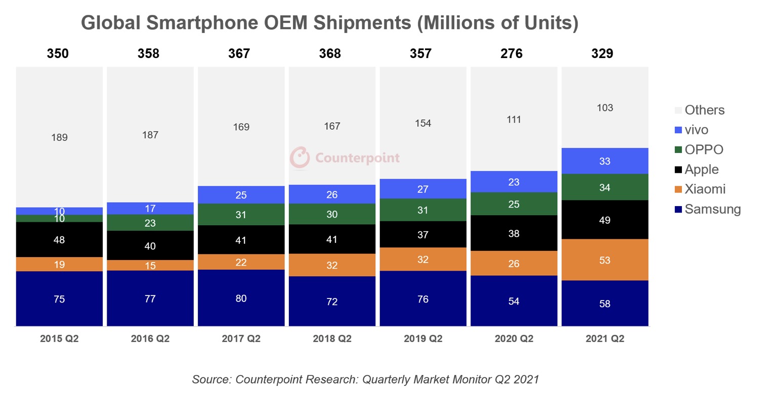 Counterpoint數據顯示,小米二季度全球市場銷量達到5300萬部,同比增長103.8%。
