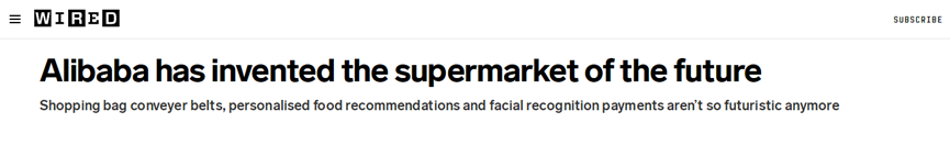 《Wired》雜志以“Alibaba has invented the supermarket of the future”(阿里巴巴創造的未來超市)為題報道,文章中對阿里旗下盒馬的表述是:“超高科技超市和最先進的履約中心融為一體”。