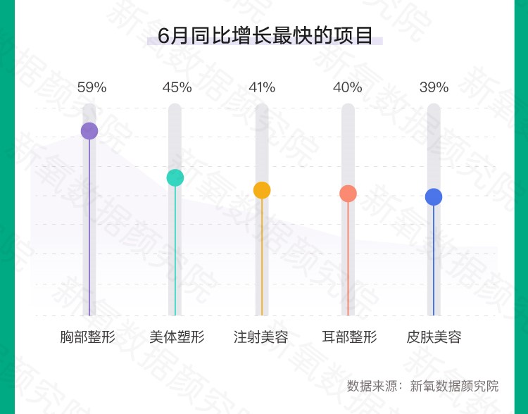于此同時,胸部整形、美體塑形不僅實現高速的環比增長,更是在去年同期熱度較高的基礎上,實現同比增長59%、45%,位居6月同比增速前兩位。在夏季,對身材的關注成為醫美消費的“剛需”。