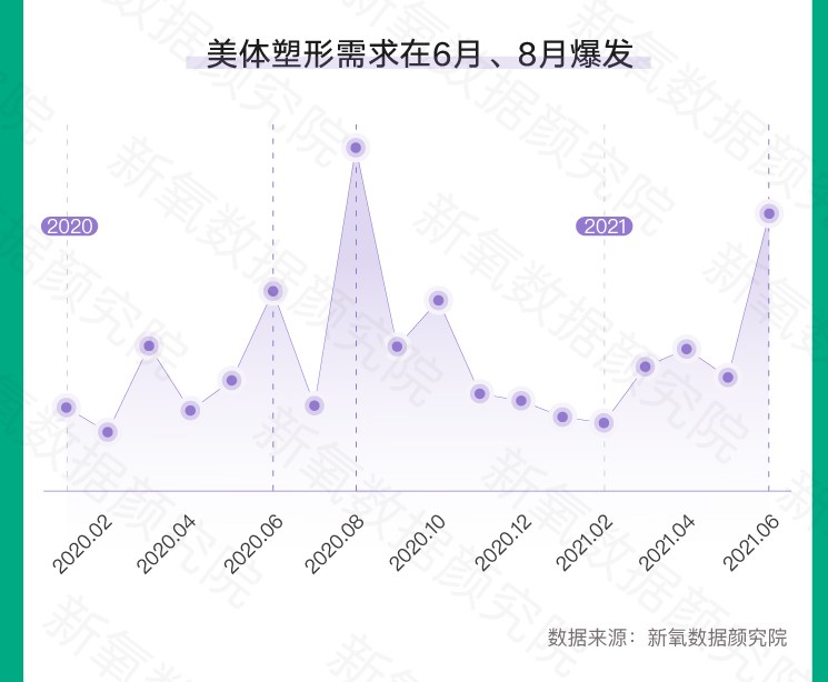 胸部整形消費中占比最大的是隆胸,美體塑形消費中占比最大的是吸脂、其次是冷凍溶脂。從新氧數據顏究院數據來看,瘦身類醫美消費在6月份的爆發,還會持續延續至8月份。根據去年的數據,2020年6月美體塑形消費環比增長116%,而到了8月份,環比增幅進一步提升至411%。
