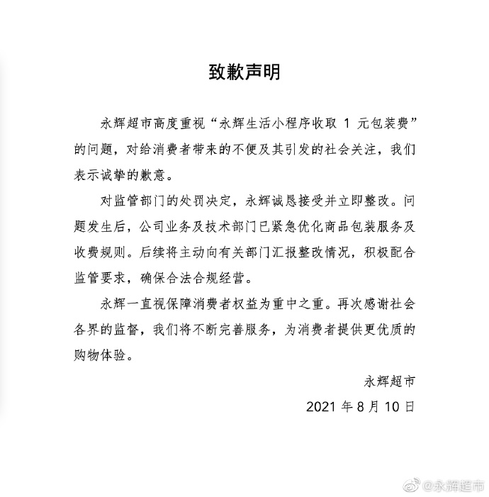 聲明中,永輝超市表示,其將高度重視“永輝生活小程序收取1元包裝費”的問題,同時就此事給廣大消費者帶來的不便及此事所引發(fā)的各方社會關(guān)注表示真誠地歉意。談到監(jiān)管部門的處罰決定,永輝超市表示:誠懇接受并立即整改。“問題發(fā)生后,公司業(yè)務(wù)及技術(shù)部門已緊急優(yōu)化商品包裝服務(wù)及收費規(guī)則。后續(xù)將主動向有關(guān)部門匯報整改情況,積極配合監(jiān)管要求,確保合法合規(guī)經(jīng)營。”