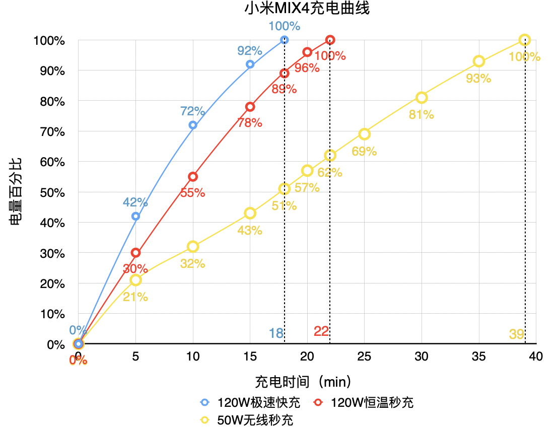 在無線充電方面,小米MIX 4支持50W的無線靜音充電,但值得一提的是,在手機設置中開啟極速無線充電模式的選項后,配合小米100W風冷無線充電底座,在充電時最高可以達到100W的峰值功率。在無線充電初期可以通過100W功率為手機快速補充電量,隨后維持在50W功率,保證充電的功率與發熱的平衡,0-100%充電共耗時39分鐘。