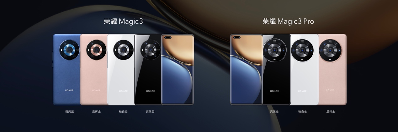 榮耀Magic3系列以蘊含東方哲學的秩序美學設計,取自大自然夢幻時刻“Magic Hour”的全新配色,其中榮耀Magic3和榮耀Magic3 Pro將機身背部圓形攝像頭模組居中,打造出獨具一格的“繆斯之眼”。