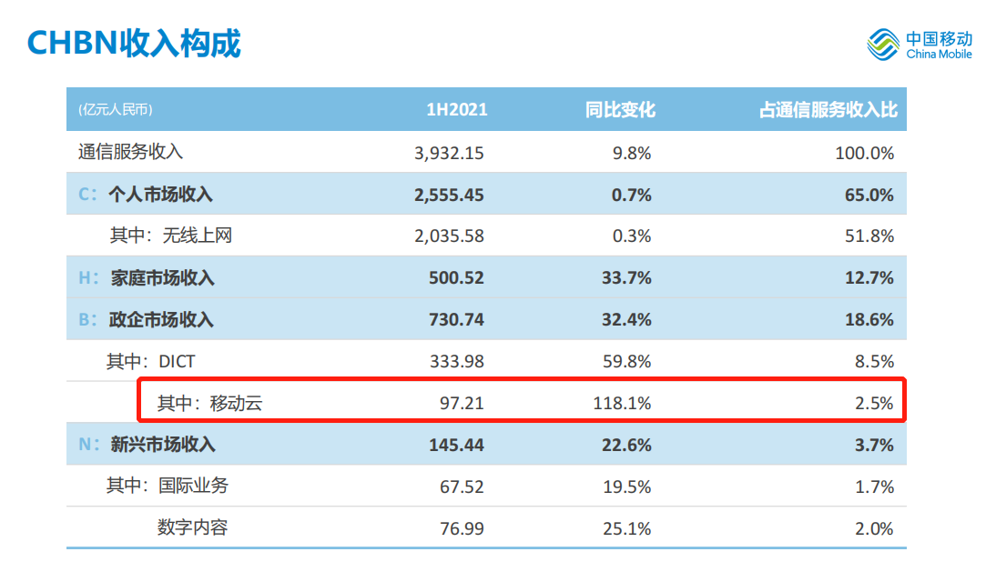 政企市場動能強勁,DICT 收入達人民幣 334 億元,同比增長 59.8%。其中,移動云收入達人民幣 97.21 億元,同比增長 118.1%,超2020年全年營收,且公有云收入份額進入業界前十行列,再次跑出加速度。