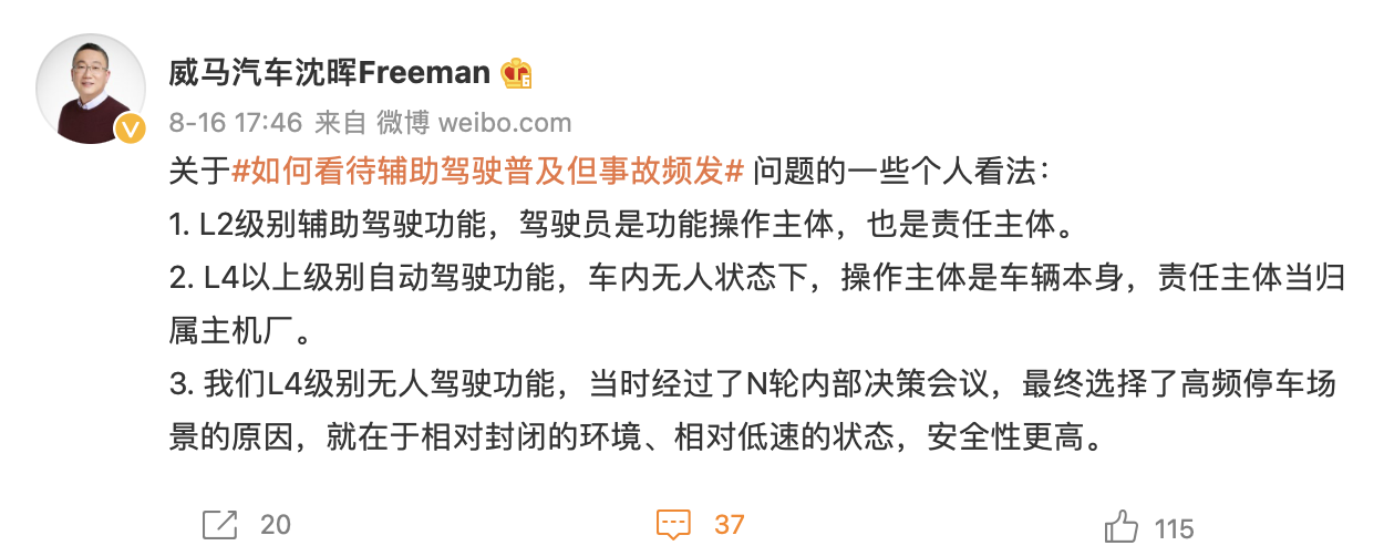 對此,今日威馬汽車創始人沈暉在個人微博下,針對于“如何看待輔助駕駛普及但事故頻發”發表了自己的看法。他表示:L2級別輔助駕駛功能,駕駛員是功能操作主體,也是責任主體。L4以上級別自動駕駛功能,車內無人狀態下,操作主體是車輛本身,責任主體當歸屬主機廠。同時指出威馬L4級別無人駕駛功能,最終選擇了高頻停車場景的原因,原因在于相對封閉的環境、相對低速的狀態,安全性更高。