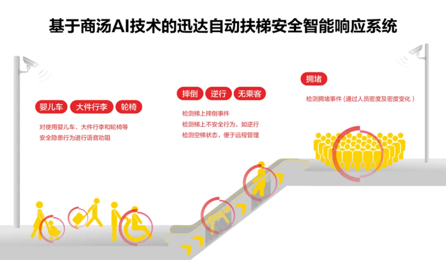 世界領先自動扶梯企業迅達通過融合商湯在物體檢測、行為識別、密度分析等領域的AI技術優勢,可以將電梯上的各類情景結構化處理,定義出乘客逆行、推行嬰兒車、輪椅、攜帶大件行李,或是乘客摔倒等事件,并在事件發生時,及時報警,并采取降低運行速度或者停止電梯等操作。整個交互流程都能自動完成,重塑過去的被動化響應模式。