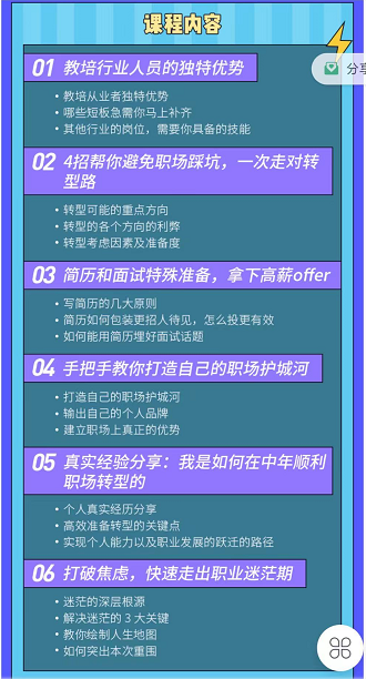 據(jù)悉,轉(zhuǎn)型陪伴營(yíng)共設(shè)置了6大課程。從正確認(rèn)識(shí)自身優(yōu)勢(shì)、多方位看待職業(yè)轉(zhuǎn)型的認(rèn)知建設(shè),到簡(jiǎn)歷及面試準(zhǔn)備的實(shí)操技能,再到長(zhǎng)遠(yuǎn)職業(yè)規(guī)劃,幫助教育培訓(xùn)行業(yè)從業(yè)者線性看待職業(yè)發(fā)展,做出更準(zhǔn)確合理判斷的同時(shí),斬獲更好職業(yè)機(jī)會(huì)。