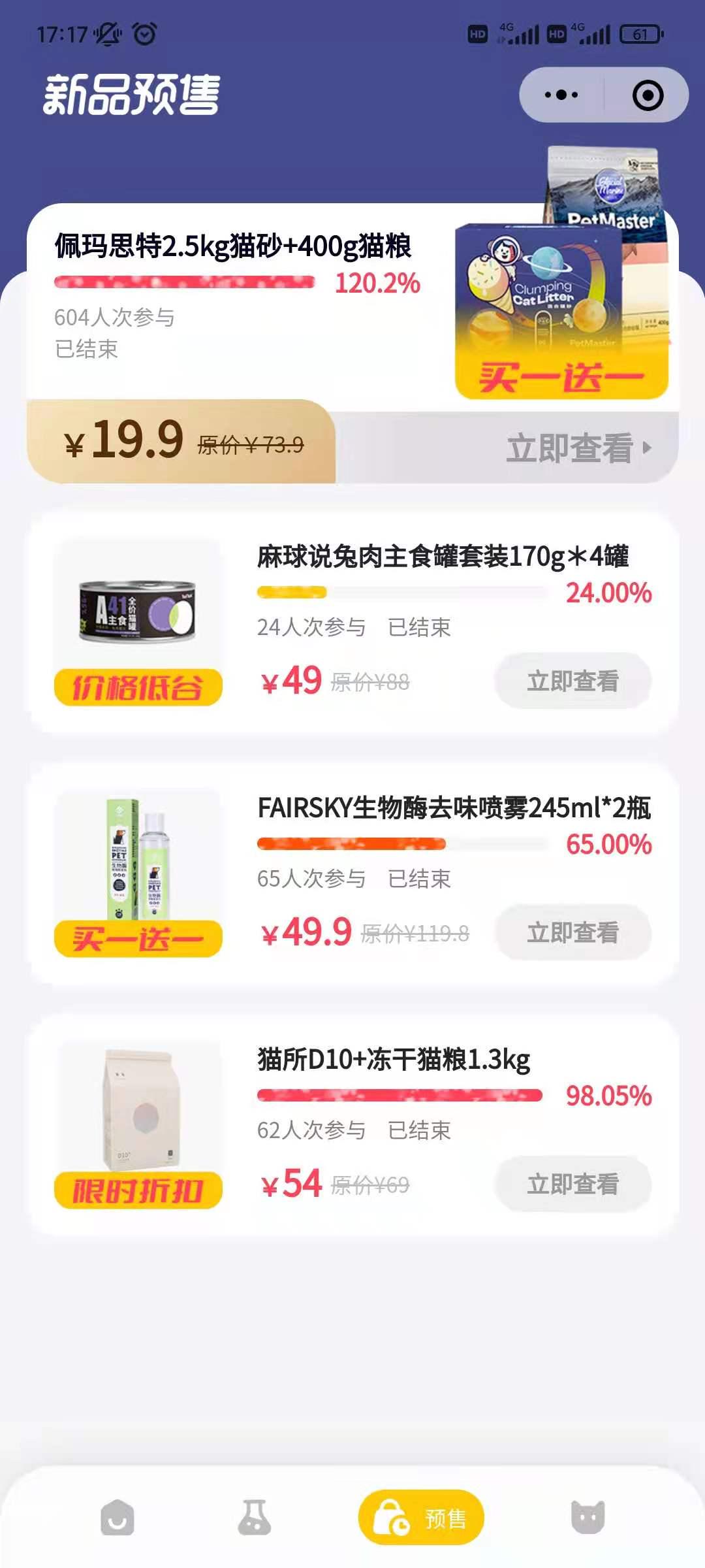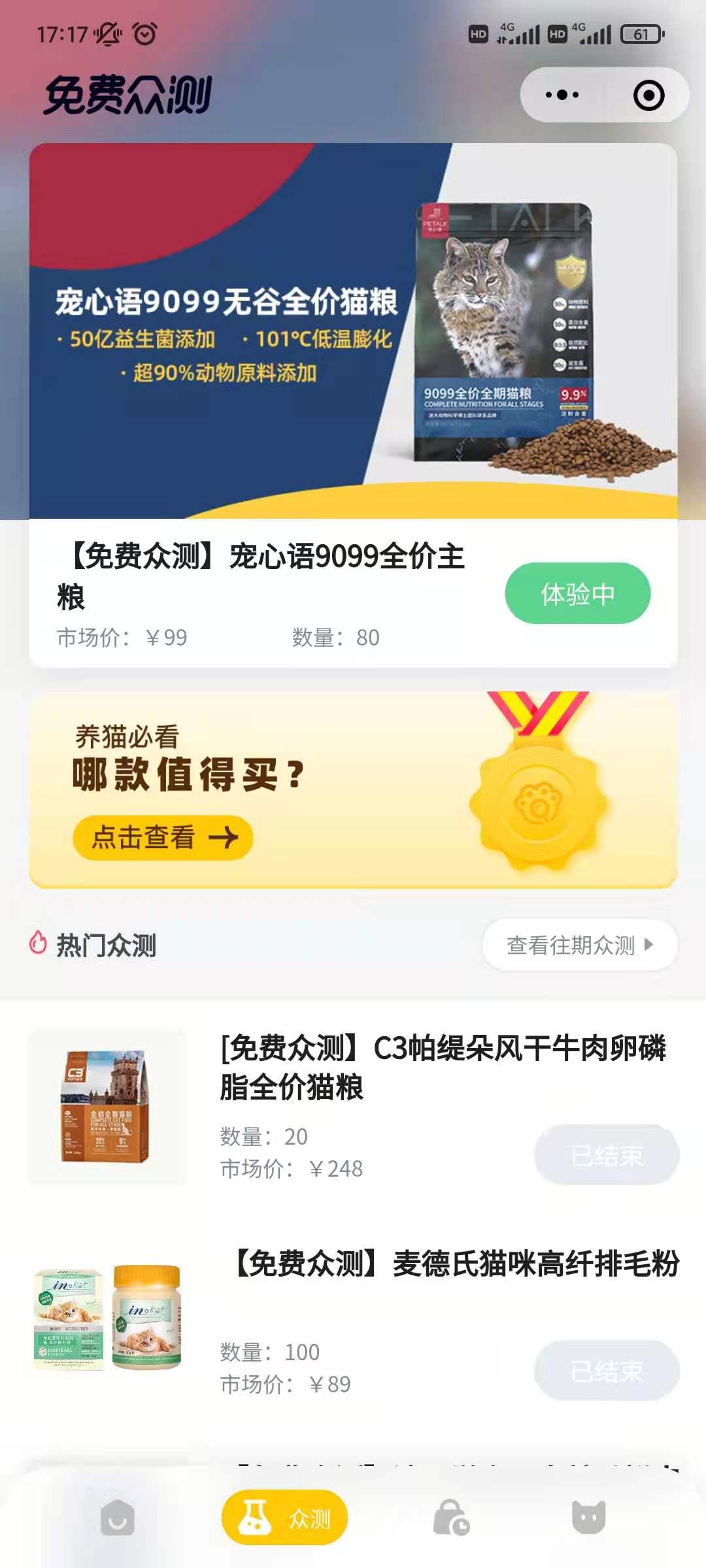 爪測是貓來了旗下的一款寵物品類小程序,在本次預售前,一直處于灰度測試階段。使用爪測小程序,在社區版塊,鏟屎官可以創建或參與話題討論,上傳貓咪的美照與養貓趣事,關注喜歡的貓咪博主,分享養貓經驗、好物種草等。在電商版塊,鏟屎官可以免費參與各大品牌的商品眾測,低價搶到各個寵物品牌的新品爆款。爪測,儼然已初步具有成熟寵物社交平臺的特質。